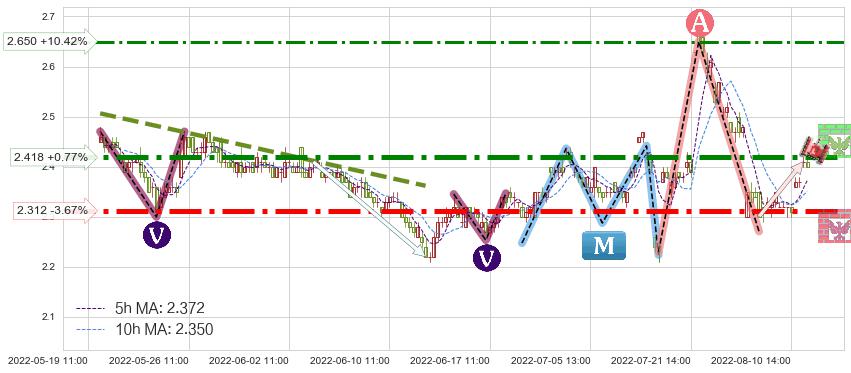♘ 阻力价格位2.418,可信任强度85.16%,距离最后交易2022-08-12 14:00形成的收盘价格2.400相差 +0.77%