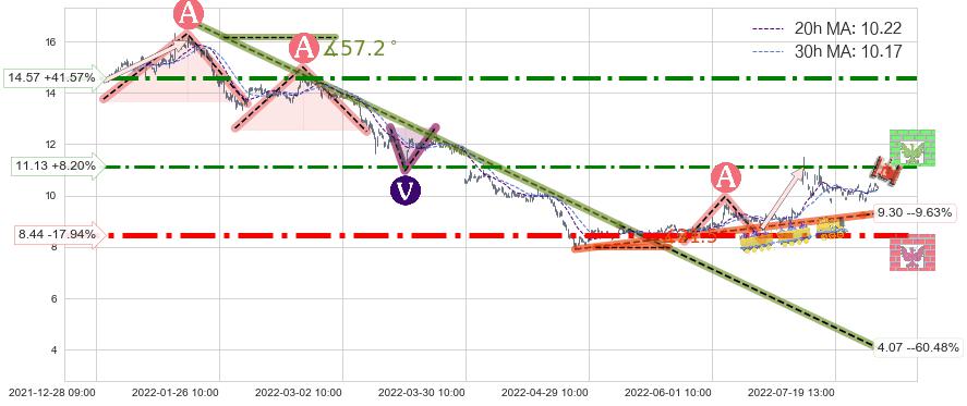 从2022-01-19 09:00至2022-05-11 10:00,共包含352个小时,阶段股价下跌-58.41%,阶段股价变动位移路程比: 1 : 4,下跌趋势角度: 57.2