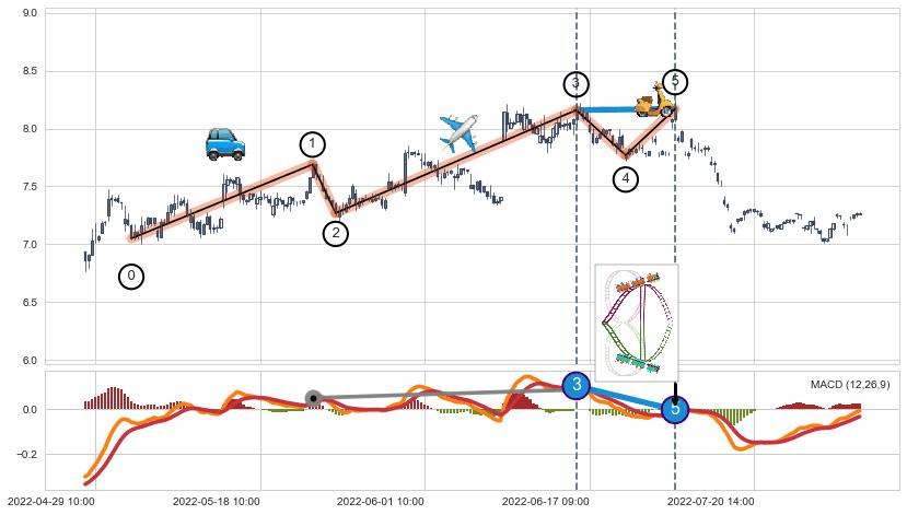 从2022-05-13 10:00至2022-06-08 11:00,共包含87个小时,阶段股价上涨3.46%,阶段股价变动位移路程比: 1 : 16