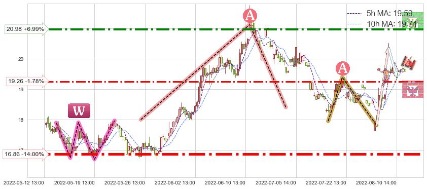 ♞ 5小时均线:19.59,10小时均线:19.74→ 快线<慢线
