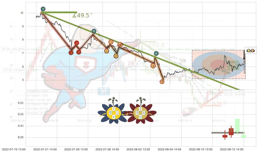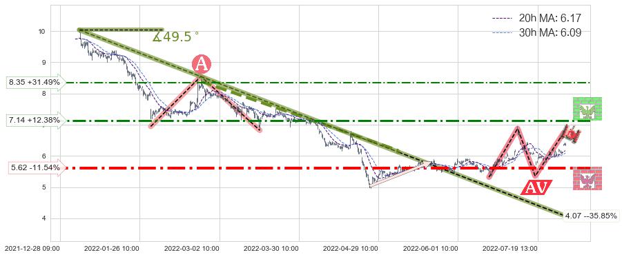 ♘ 阻力价格位7.14,可信任强度57.97%,距离最后交易2022-08-12 14:00形成的收盘价格6.35相差 +12.38%