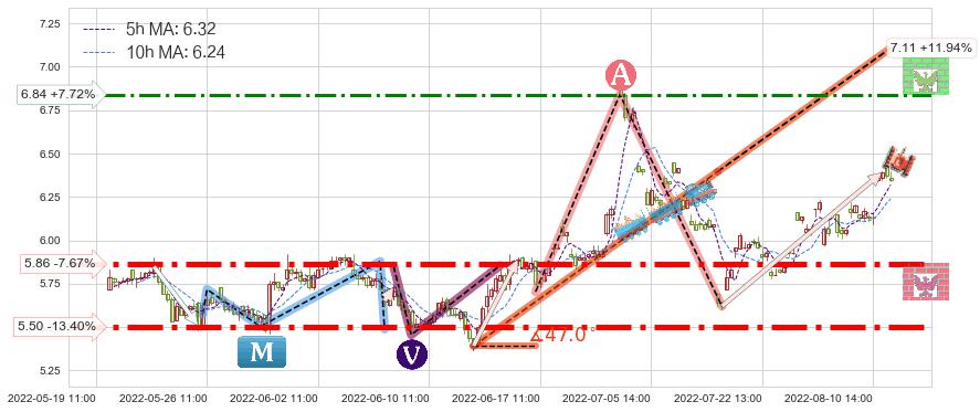 ♘ 阻力价格位6.84,可信任强度56.08%,距离最后交易2022-08-12 14:00形成的收盘价格6.35相差 +7.72%