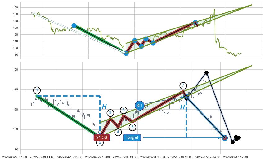 ➣ 升楔型:下跌目标target已达成:猜想强支撑位临近,预期反弹上涨(均值回复)