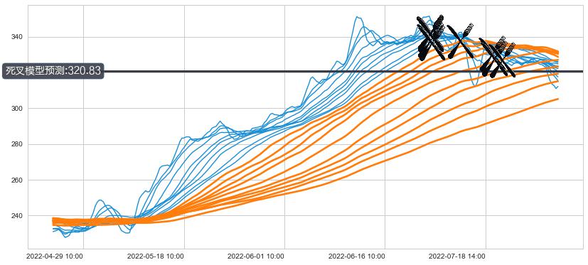 ➢ 10小时均线于(07-20 13:00: 330.01)形成【死叉】基于【死叉历史模型】预测死叉后最低波谷价格: 321.10, 死叉后最低价格305.95,已经下跌超出预测最低波谷价格, 预期反弹