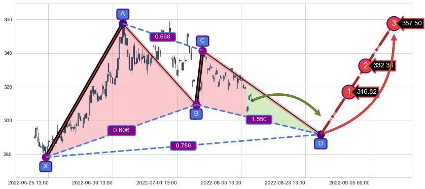 ➢ 距离预测D点位置尚有下跌空间,短线依然【看跌】, 耐心等待看涨【伽利】形态反转启动