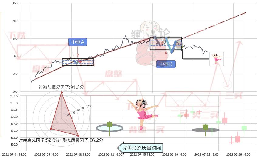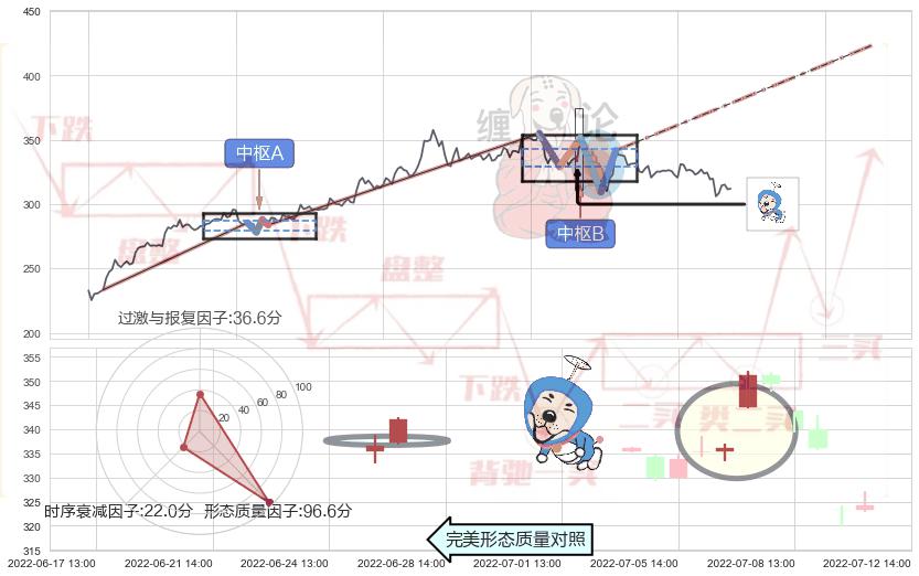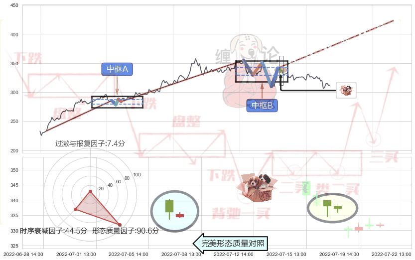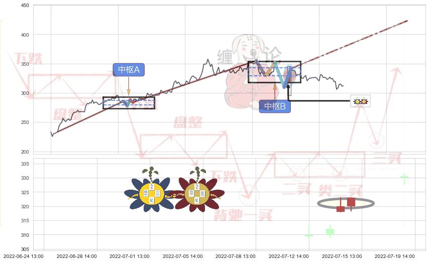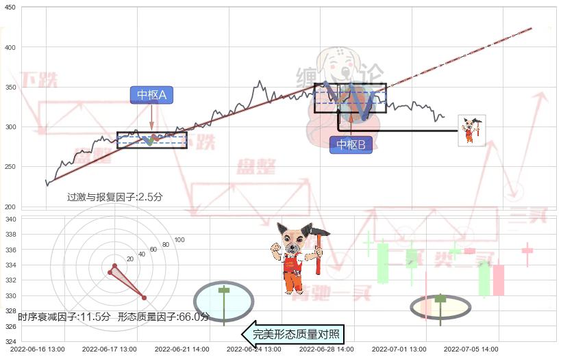 ➣ 【中枢B】:06-28:13-07-15:13,中枢由5笔构成,共27交易小时, ZG=341.52, ZD=329.09