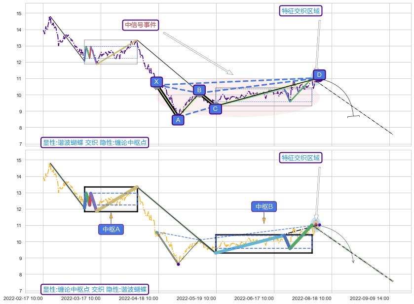 ➣ 缠论中枢点:猜想破位中枢B后持续下拉 → 下跌 → 破位中枢B支撑 → 持续趋势跟踪