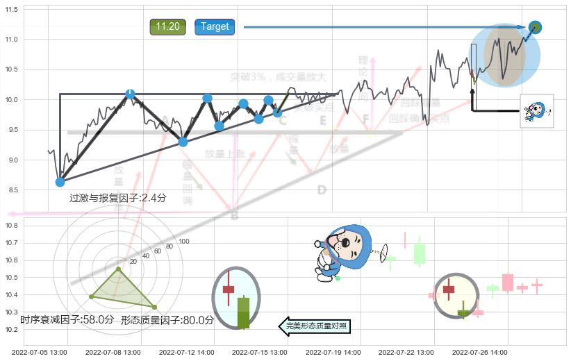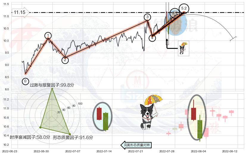 从2022-04-27 09:00至2022-08-12 14:00,共包含247个小时,阶段股价上涨25.98%,阶段股价变动位移路程比: 1 : 8,上涨趋势角度: 24.5,2022-07-07 13:00向⇪形成缺口,跳空上涨+10.00%