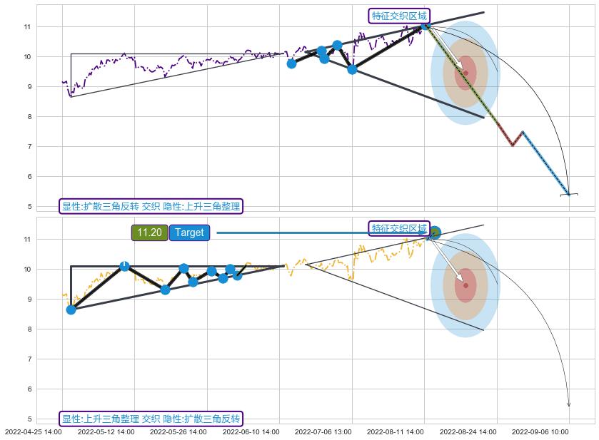 ➣ 扩散三角反转:猜想临近关键支撑位突破点 → 临近拐点下跌 → 风险信号 → 大趋势均值回复