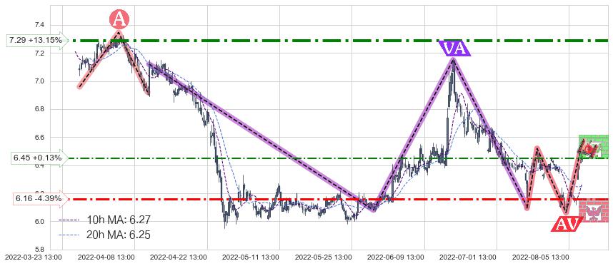 ♘ 阻力价格位6.45,可信任强度42.85%,距离最后交易2022-08-12 14:00形成的收盘价格6.44相差 +0.13%