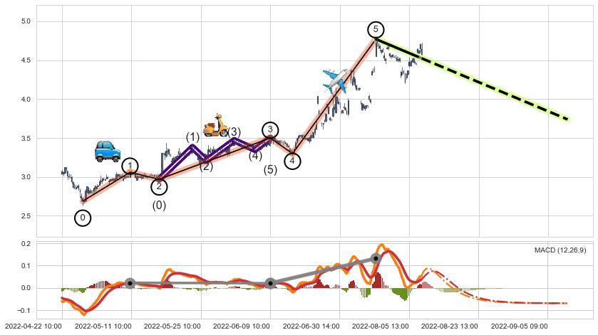 ➣ 突破缺口形成后,后续k已经超过14根,跳空突破波浪理论(5浪)关键点后, 出现【完全回踩】迹象, 但后续走势回踩幅度持续降低,缺口压制继续,短期收盘价回补缺口第一根k线低点