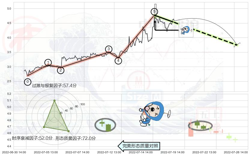 从2022-04-27 10:00至2022-08-03 13:00,共包含232个小时,阶段股价上涨52.27%,阶段股价变动位移路程比: 1 : 5,上涨趋势角度: 25.3,2022-07-06 13:00向⇪形成缺口,跳空上涨+10.05%