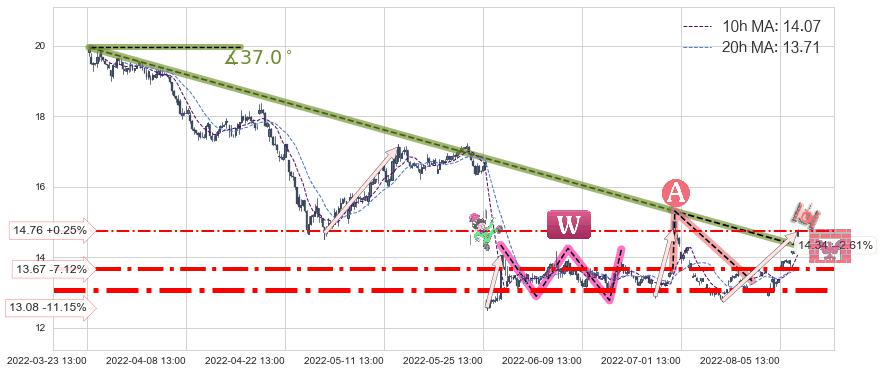 ➢ 预测:2022-08-18 13:00,【试探阻力】稳定目前下跌趋势的前提下,预测价格:13.97