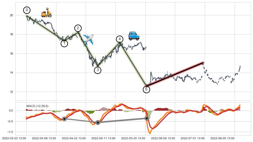 ➣ 波浪理论:猜想达到c点后小反弹终止反转下跌 → 下跌 → 【拐点】临近 → 阶段均值回复结束后继续大周期趋势跟踪