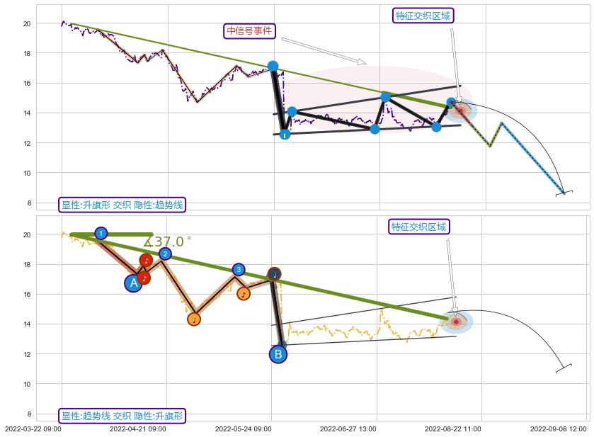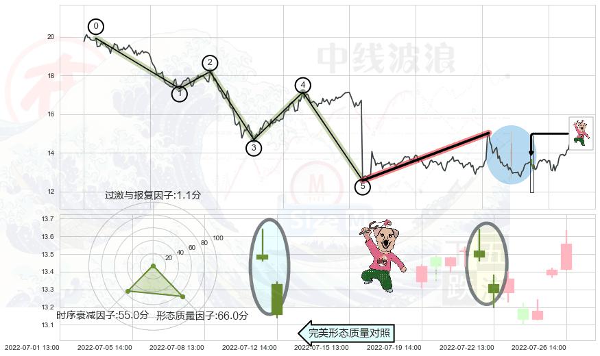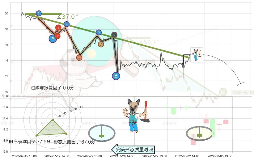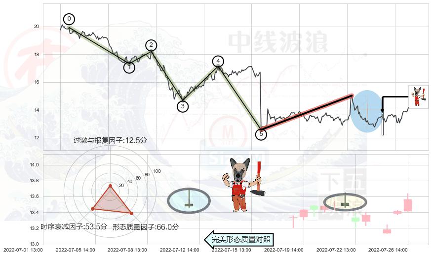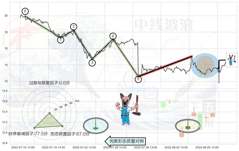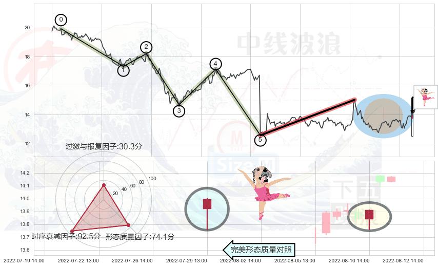 从2022-07-15 14:00至2022-08-12 14:00,共包含39个小时,阶段股价上涨14.62%,阶段股价变动位移路程比: 1 : 2