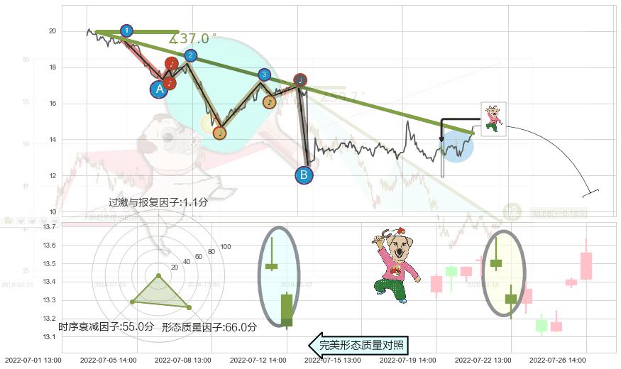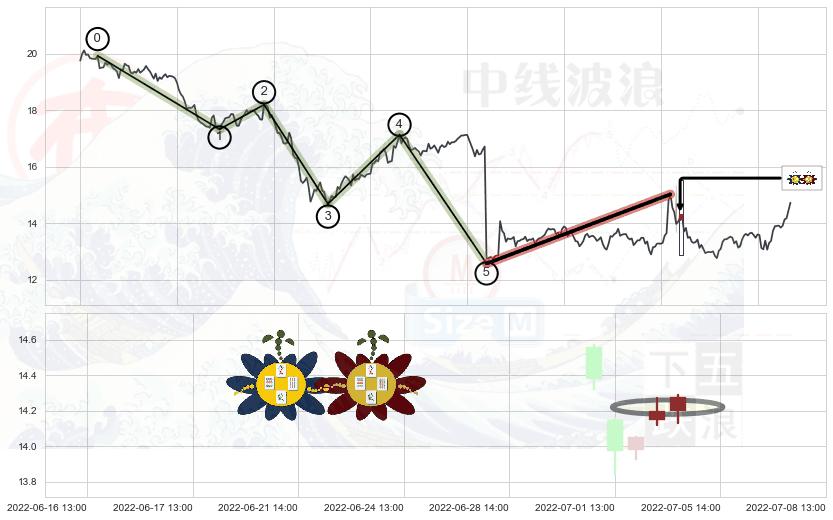 从2022-06-29 13:00至2022-07-15 14:00,共包含26个小时,阶段股价下跌-14.53%,阶段股价变动位移路程比: 1 : 2.0