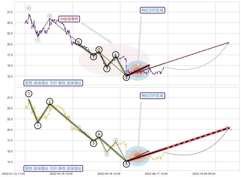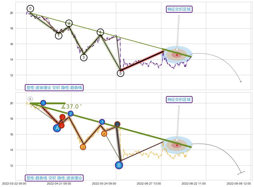 从2022-04-28 13:00至2022-05-13 09:00,共包含38个小时,阶段股价上涨15.70%,阶段股价变动位移路程比: 1 : 2