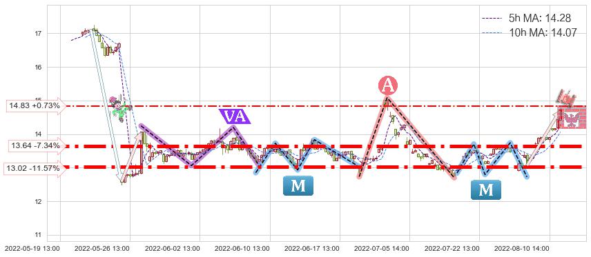 从2022-08-03 14:00至2022-08-12 14:00,共包含13个小时,阶段股价上涨12.08%,阶段股价变动位移路程比: 1 : 1.1