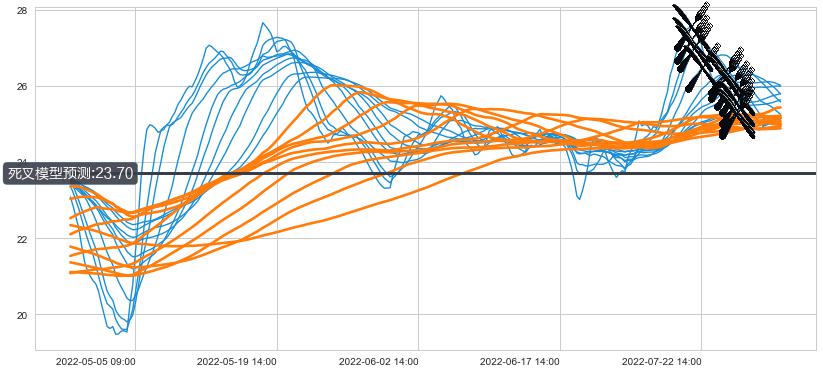 ➣ 21小时均线于(07-22 14:00: 26.46)形成【死叉】基于【死叉历史模型】预测死叉后最低波谷价格: 24.69, 死叉后最低价格24.67,虽然已经到达预测最低波谷价格,但耗时间很短动能很强, 预期继续下跌