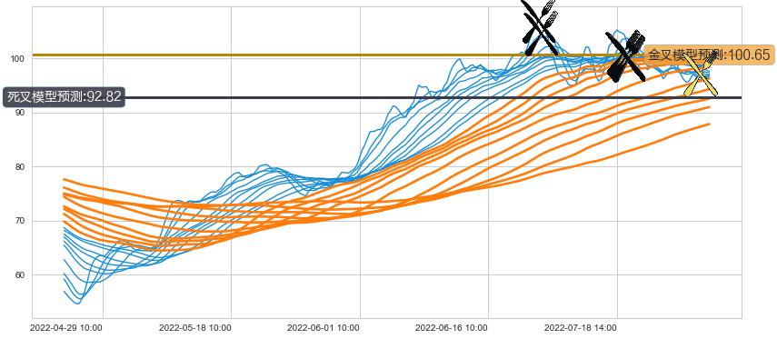➢ 21小时均线于(07-19 14:00: 100.73)形成【死叉】基于【死叉历史模型】预测死叉后最低波谷价格: 95.47, 死叉后最低价格94.01,已经下跌超出预测最低波谷价格, 预期反弹