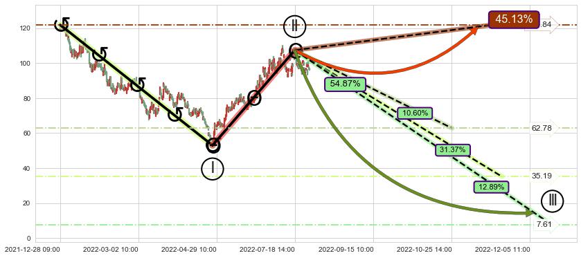 ➣ 调整浪已超过预测的c点位置,后续大趋势循环浪继续下跌概率54.87%,谨慎做多
