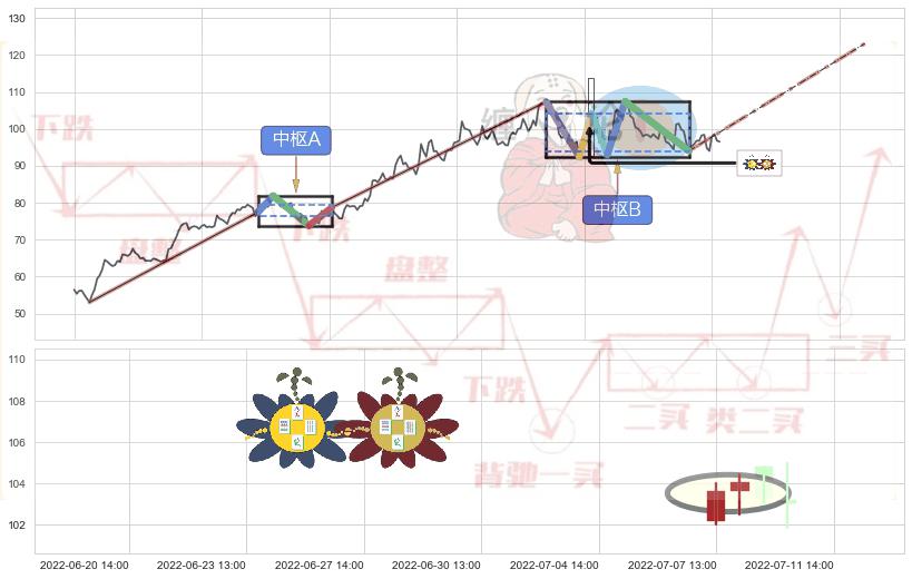 ➣ 【中枢B】:06-24:14-08-03:14,中枢由6笔构成,共57交易小时, ZG=104.08, ZD=94.01