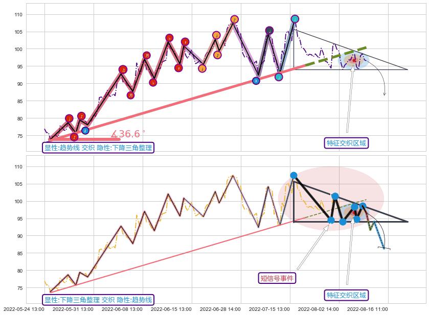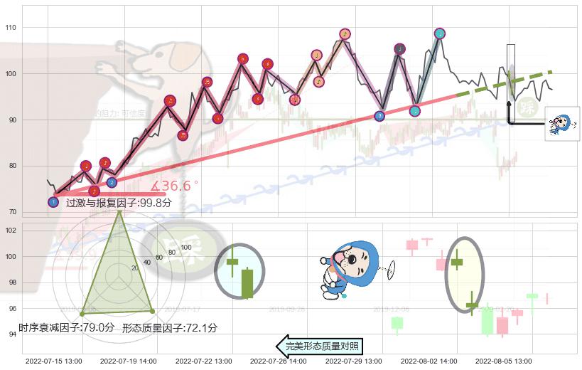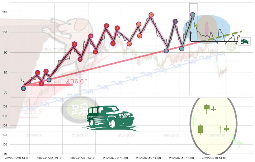 ➣ 2022-05-25 10:00-2022-07-21 13:00上升趋势存在反转[风险],其原上升趋势的支撑位(100.38)已破位[强阻力信号],原上升趋势角度: 36.6˚