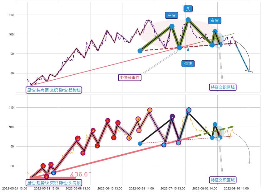 ➢ 【已确认突破】头肩顶 起点:06-21:13,突破点:08-03:14,形态共64交易小时
