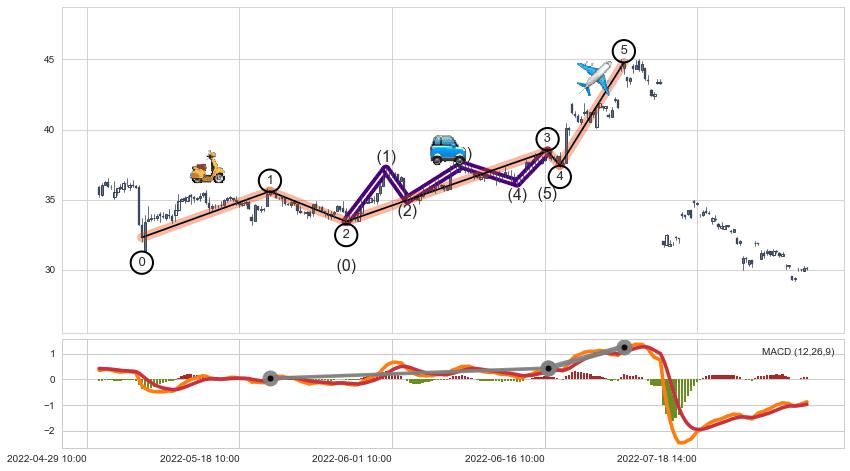 从2022-04-14 09:00至2022-05-20 10:00,共包含117个小时,阶段股价上涨2.16%,阶段股价变动位移路程比: 1 : 55