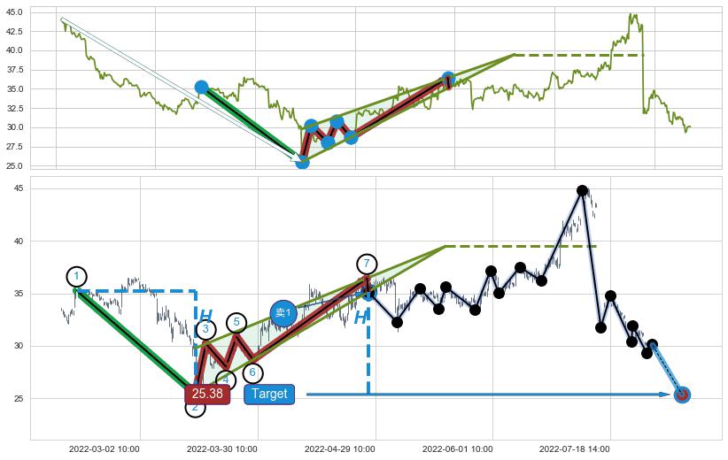 从2021-12-29 10:00至2022-02-08 11:00,共包含116个小时,阶段股价下跌-32.51%,阶段股价变动位移路程比: 1 : 2