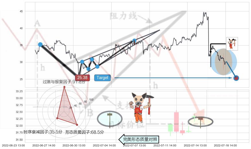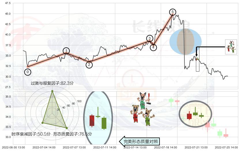 从2022-06-30 14:00至2022-08-12 14:00,共包含61个小时,阶段股价下跌-34.64%,阶段股价变动位移路程比: 1 : 2,2022-07-11 13:00向↘︎形成缺口,跳空下跌-26.48%˚