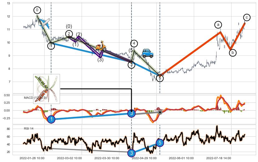 ➢ 波浪理论:猜想击穿突破c点后继续上涨 → 上涨 → 机会信号 → 小趋势跟踪