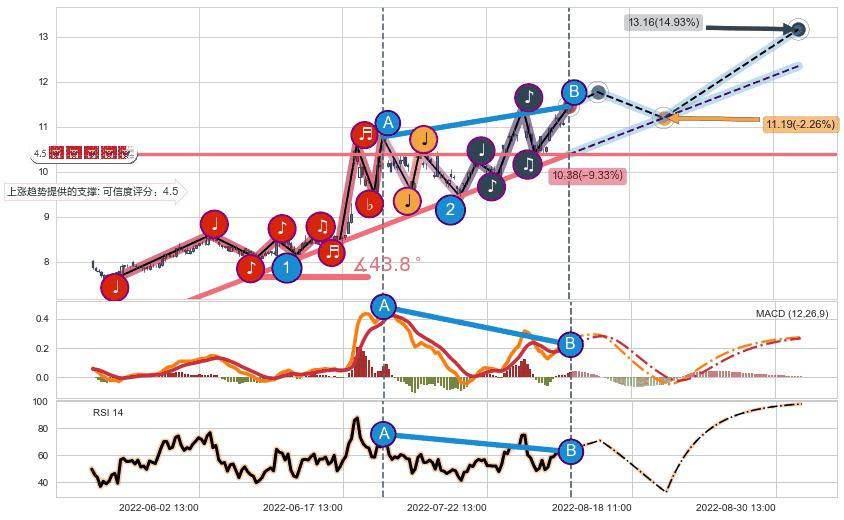 ♘ 支撑价格位9.48,可信任强度88.46%,距离最后交易2022-08-12 14:00形成的收盘价格11.45相差 -17.17%