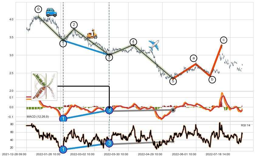 ➢ 波浪理论:猜想击穿突破c点后继续上涨 → 上涨 → 机会信号 → 小趋势跟踪