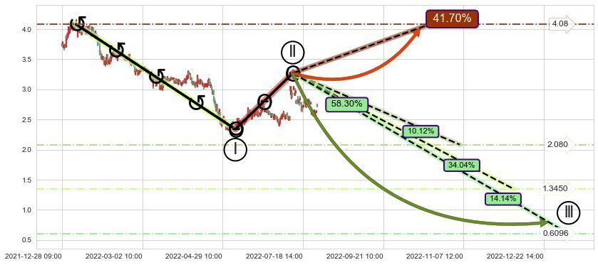 ➣ 调整浪已超过预测的c点位置,后续大趋势循环浪继续下跌概率58.30%,谨慎做多