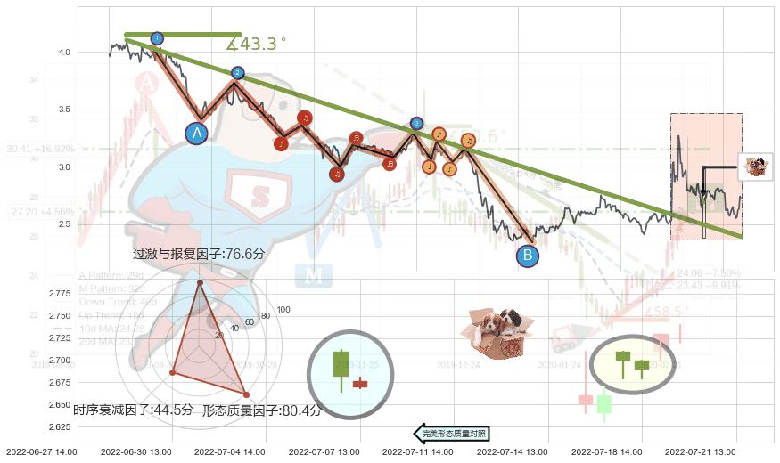 从2022-01-07 09:00至2022-04-06 09:00,共包含280个小时,阶段股价下跌-21.87%,阶段股价变动位移路程比: 1 : 8,下跌趋势角度: 61.6