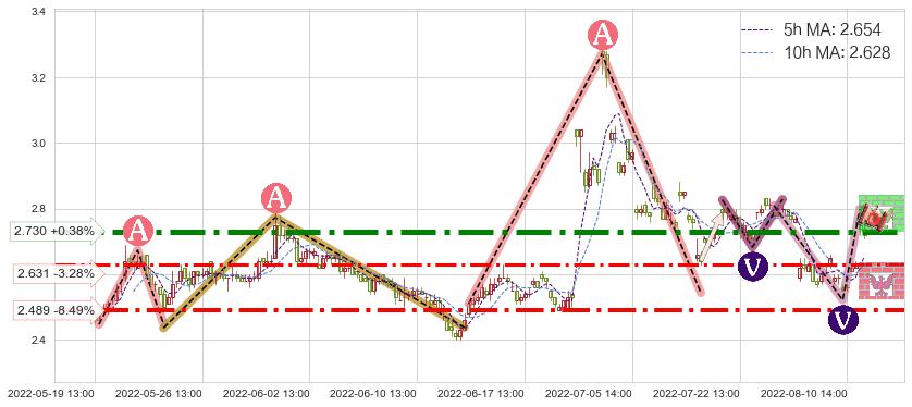 ♘ 阻力价格位2.730,可信任强度85.44%,距离最后交易2022-08-12 14:00形成的收盘价格2.720相差 +0.38%
