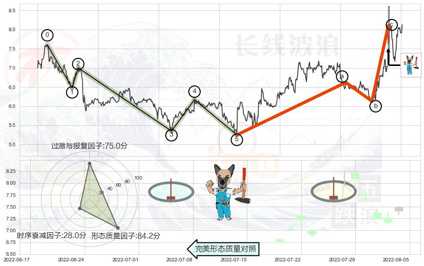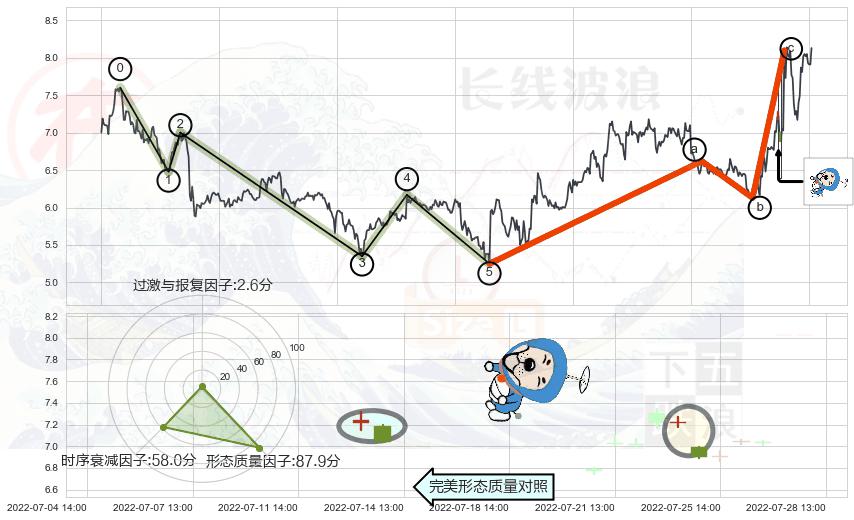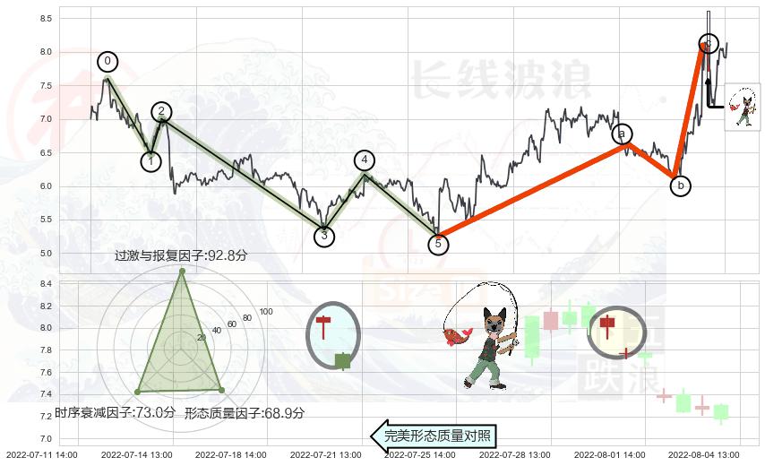 从2022-07-07 14:00至2022-08-12 14:00,共包含51个小时,阶段股价上涨30.56%,阶段股价变动位移路程比: 1 : 3,2022-07-27 13:00向⇪形成缺口,跳空上涨+15.22%
