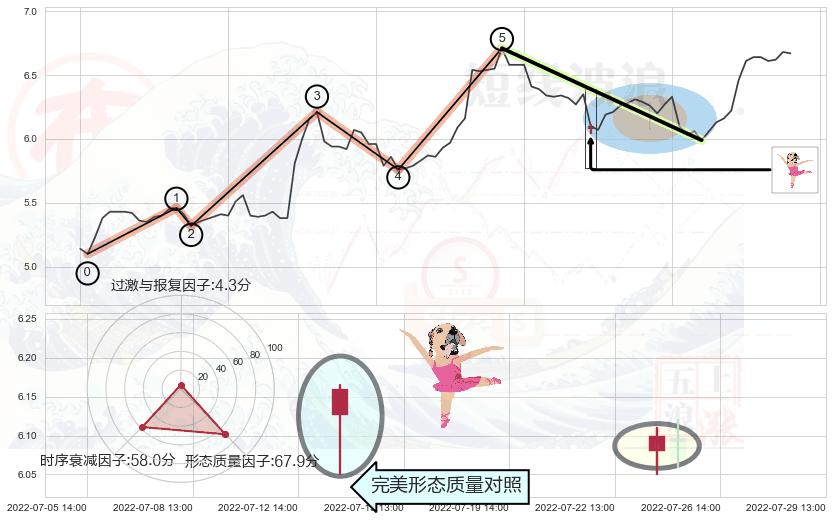 从2022-06-14 11:00至2022-07-15 14:00,共包含58个小时,阶段股价上涨26.51%,阶段股价变动位移路程比: 1 : 2,上涨趋势角度: 52.9,2022-07-13 13:00向⇪形成缺口,跳空上涨+6.17%