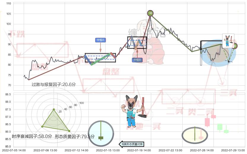 ➢ 【中枢A】:05-23:13-06-02:09,中枢由4笔构成,共38交易小时, ZG=84.40, ZD=83.30