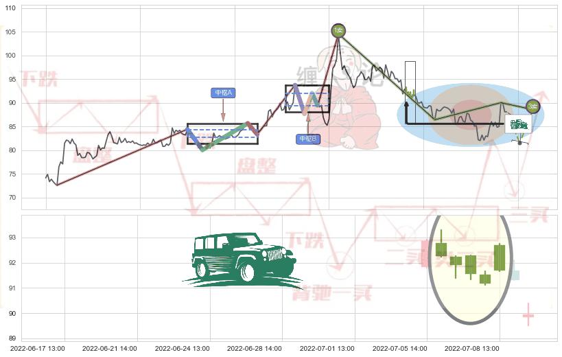 ➣ 【中枢B】:06-09:09-06-13:11,中枢由4笔构成,共13交易小时, ZG=92.01, ZD=89.43