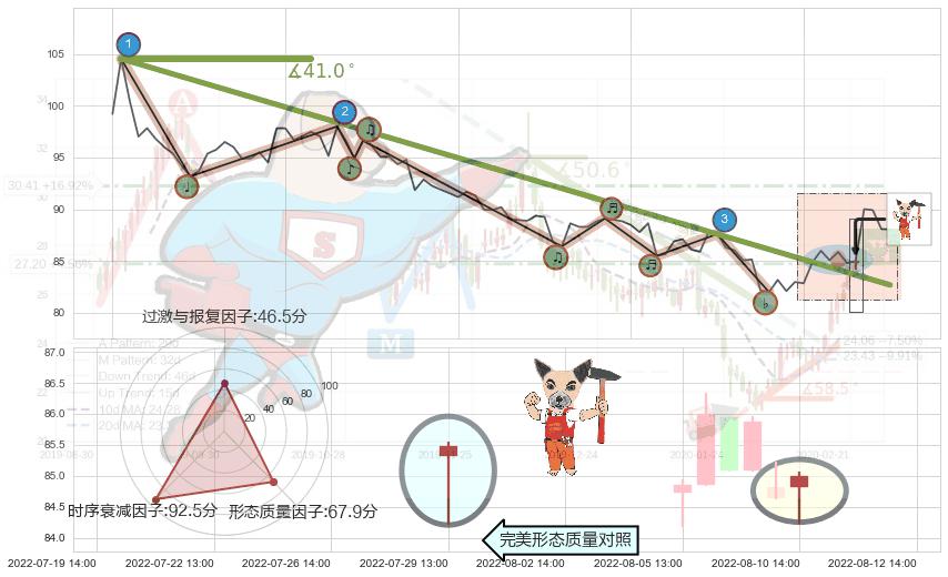 从2022-06-15 13:00至2022-08-10 14:00,共包含86个小时,阶段股价下跌-19.87%,阶段股价变动位移路程比: 1 : 4,下跌趋势角度: 41.0