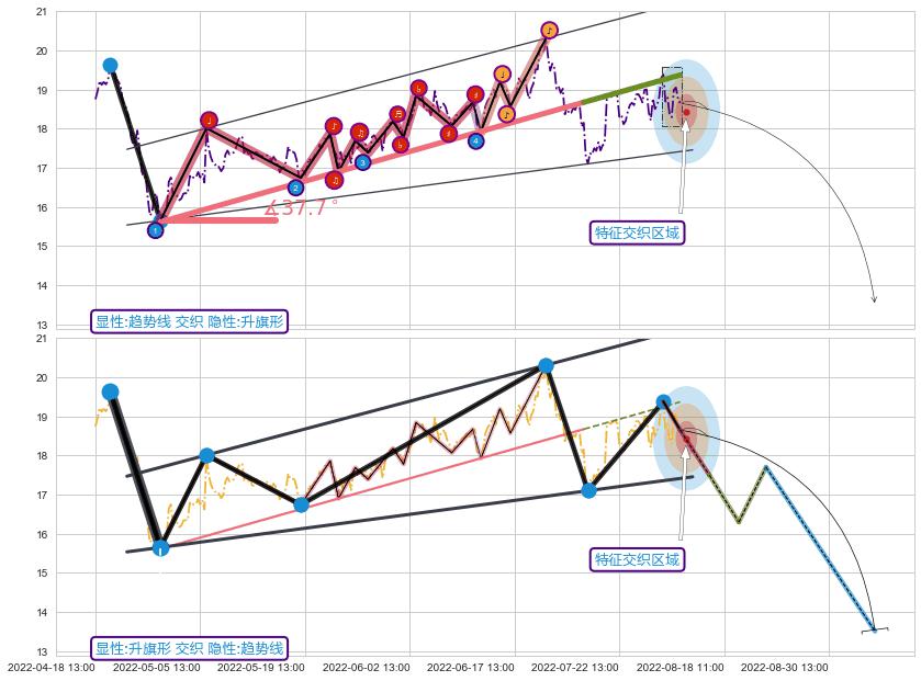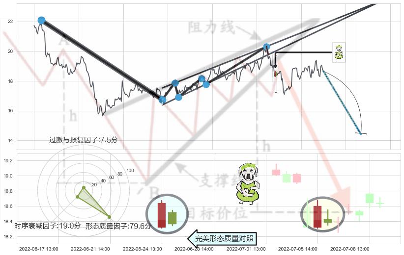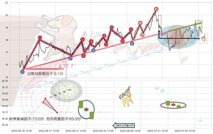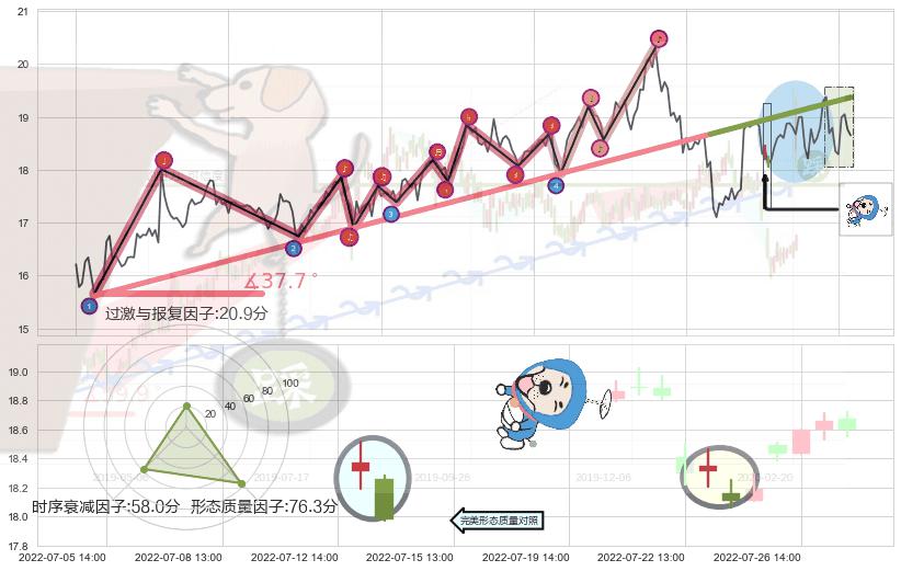➢ 2022-04-26 14:00-2022-07-11 14:00上升趋势存在反转[风险],其原上升趋势的支撑位(19.37)已破位[强阻力信号],原上升趋势角度: 37.7˚