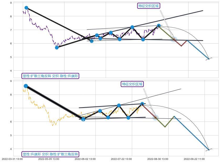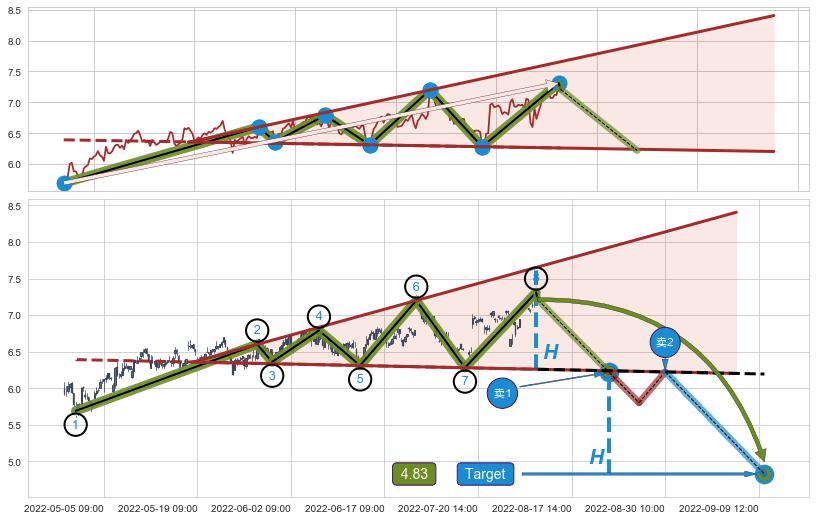 ➣ 扩散三角反转:猜想临近关键支撑位突破点 → 临近拐点下跌 → 风险信号 → 大趋势均值回复