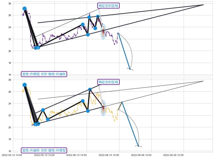 ➣ 下跌螺旋桨 + 升楔型支撑破位转换阻力下跌信号叠加后【目标达成率】中等,【看空】信号叠加【存续影响中等】