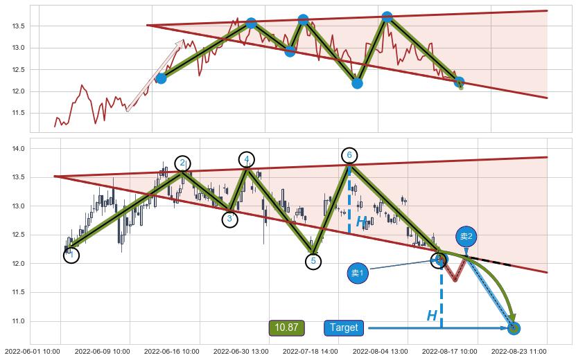 ➢ 扩散三角反转:猜想临近关键支撑位突破点 → 临近拐点下跌 → 风险信号 → 大趋势均值回复