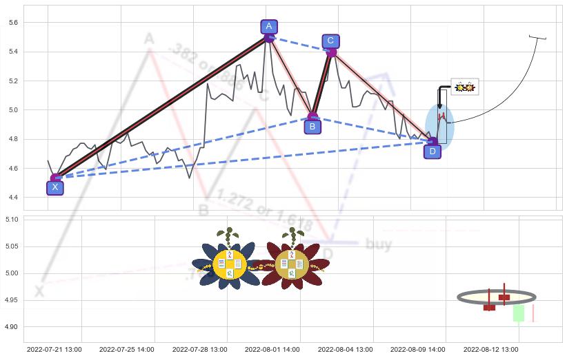 ➢ 谐波伽利:c下跌到达d:猜想拉升 → 上涨 →【拐点】强支撑临近 → 大趋势均值回复