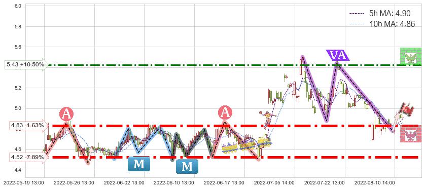 ♘ 支撑价格位4.83,可信任强度94.78%,距离最后交易2022-08-12 14:00形成的收盘价格4.91相差 -1.63%