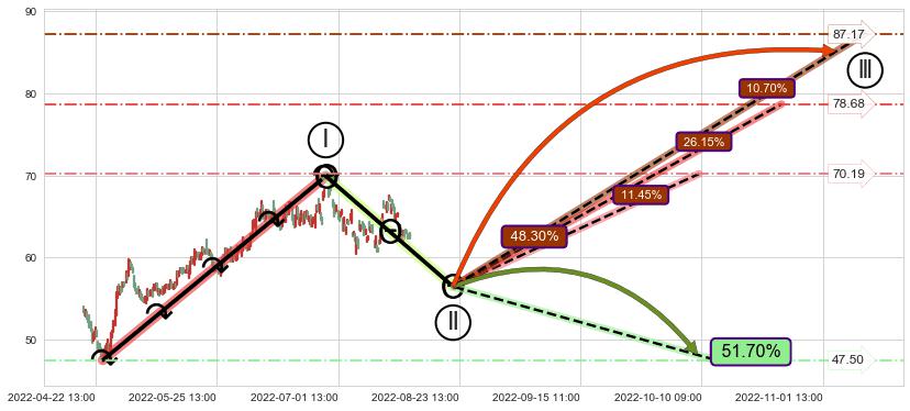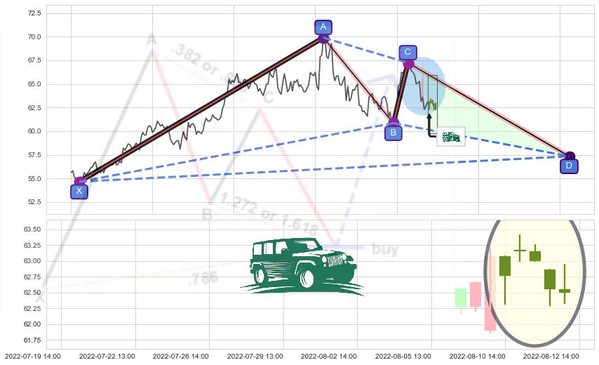➣ D点拟合预测价格57.34,距离最后交易收盘价格62.50相差 -8.25%