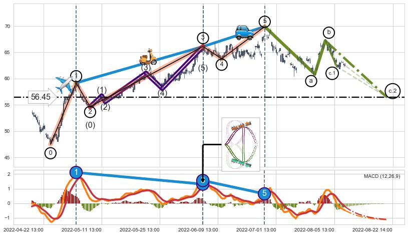 ➣ 波浪理论:猜想达到c点后小反弹终止反转下跌 → 下跌 → 【拐点】临近 → 阶段均值回复结束后继续大周期趋势跟踪